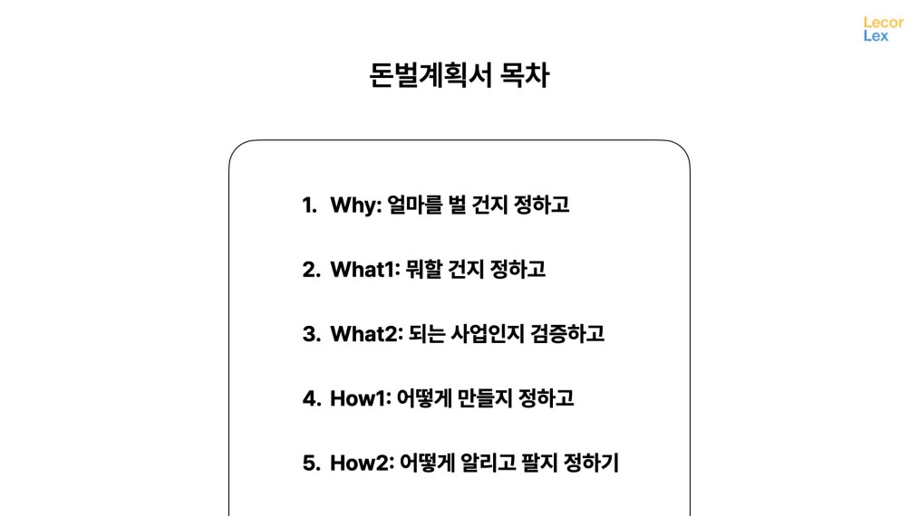 5단계로 정리했습니다. 일단 큰 틀에서 돈벌 계획서를 먼저 이해해보고 조만간 돈벌 계획서 템플릿을 공유할테니 그때 목차에 맞게 실제 작성도 해볼수 있도록 할게요.