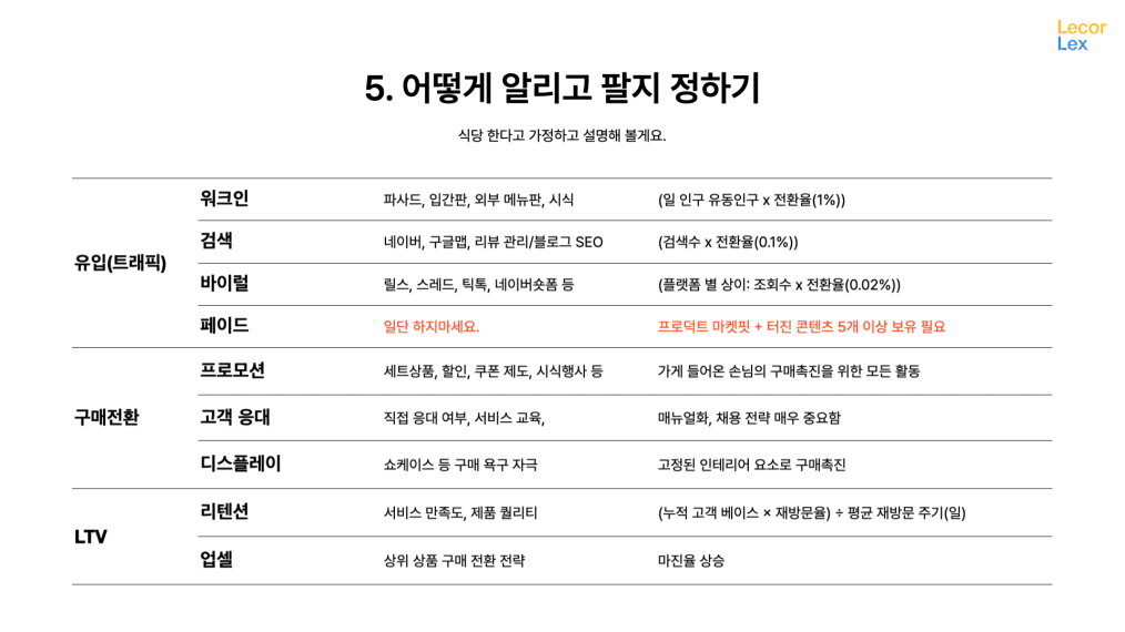 세가지만 기억하세요. 관심끌어서 유입하는 전략, 설득해서 구매하게 하는 전략, 만족시켜서 리텐션/업셀 하는 전략. 이 세가지를 구분하고 그에 맞게 전략/전술을 세워야 해요. 뭉뚱그려서(정확한 목적을 지정하지 않고) 가게 이쁘게 인테리어하고, 릴스 올리고, 메뉴판 만들면 안된다는 의미!