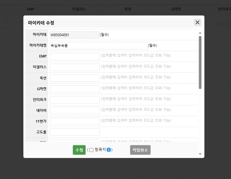 추가하신 욕실부속품에 쿠팡 카테가 안적혀있는거 같은데요? 내가 새로 추가 했다면 마이카테번호, 마이카테명, 각 마켓의 카테고리번호를 추가하신후에 새로 만드신거니까 등록으로 업로드 해주시면 됩니당😊