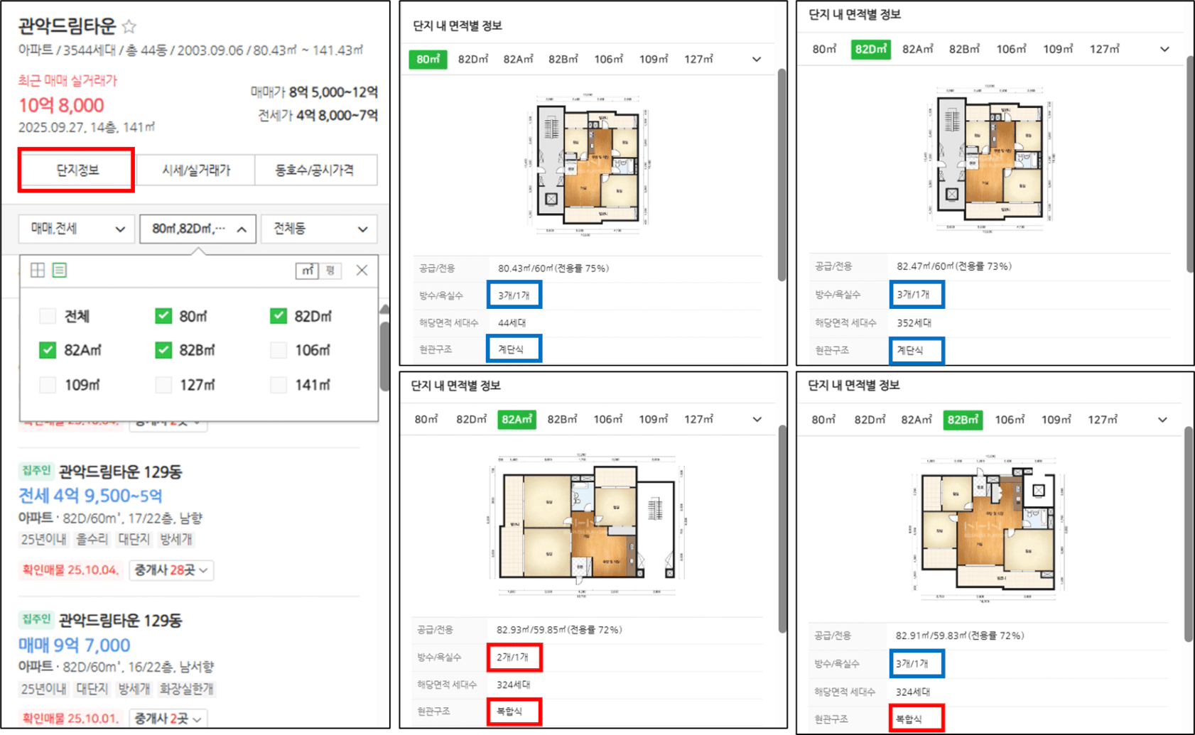 ‘단지정보’를 눌러보면, 같은 전용면적이더라도