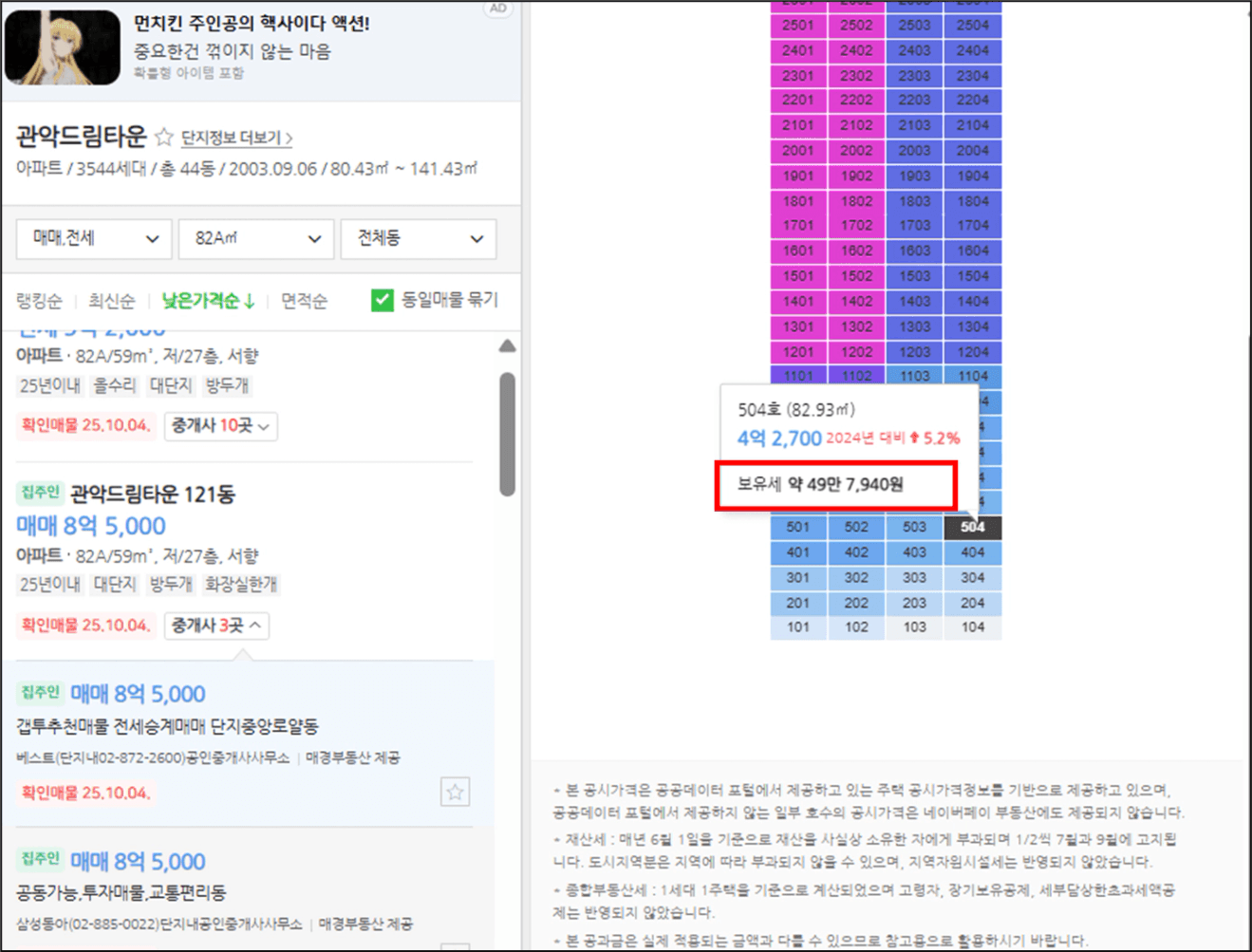 이럴 때는 저층 물건을 클릭해서 스크롤을 내려 ‘보유세’를 확인합니다.