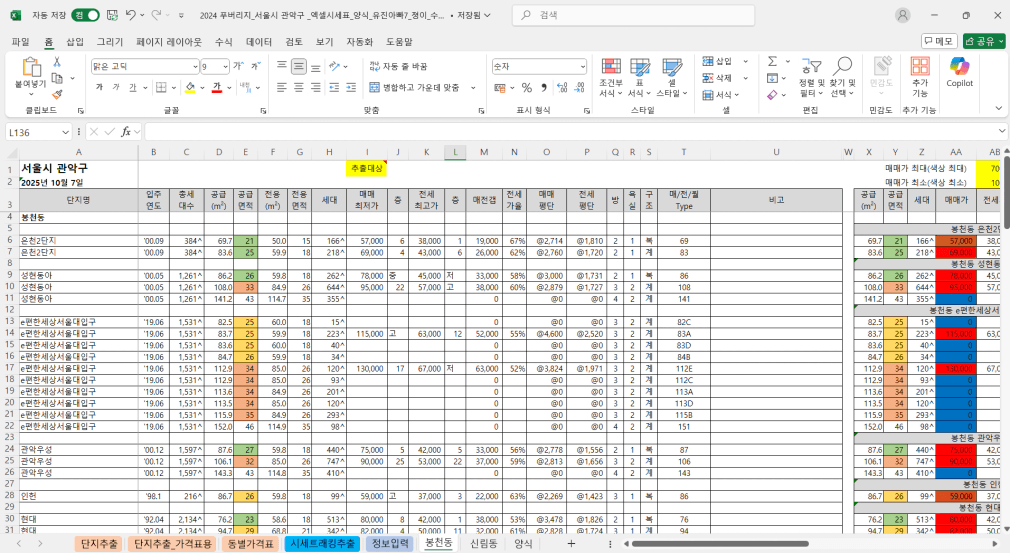 네이버 부동산 정보를 정리해서 자동화시킨 엑셀양식인데요,