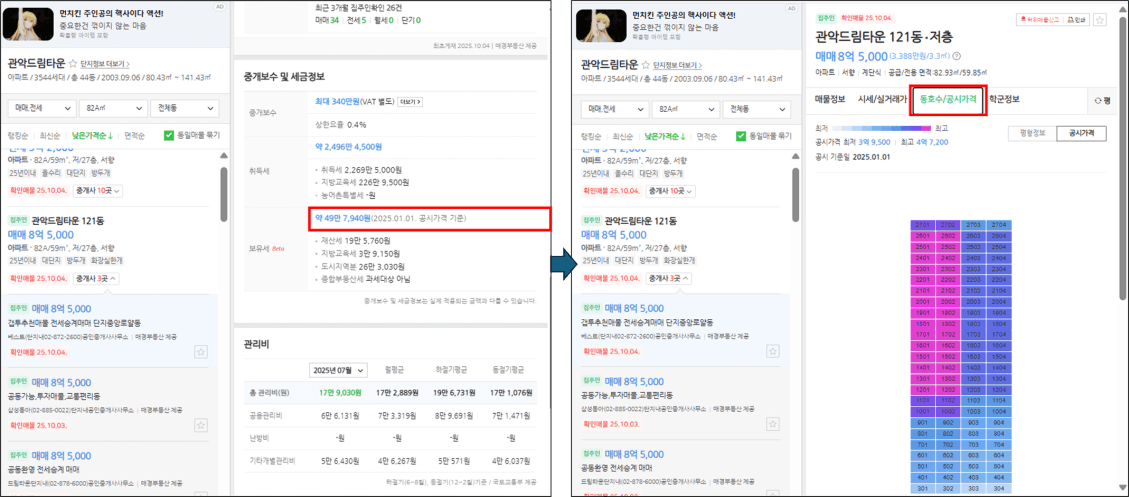 그리고 다시 스크롤을 올려 ‘동호수/공시가격’ 탭을 눌러