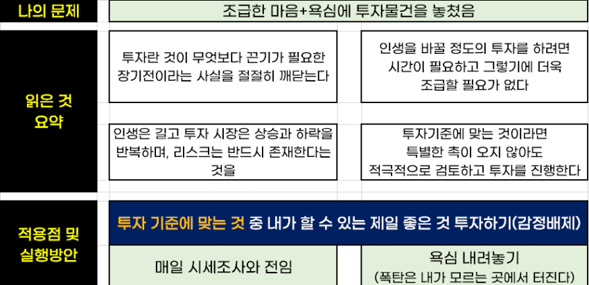 - 인생을 바꿀 정도의 투자를 하려면 시간이 필요하고 그렇기에 더욱, 조급할 필요가 없다.