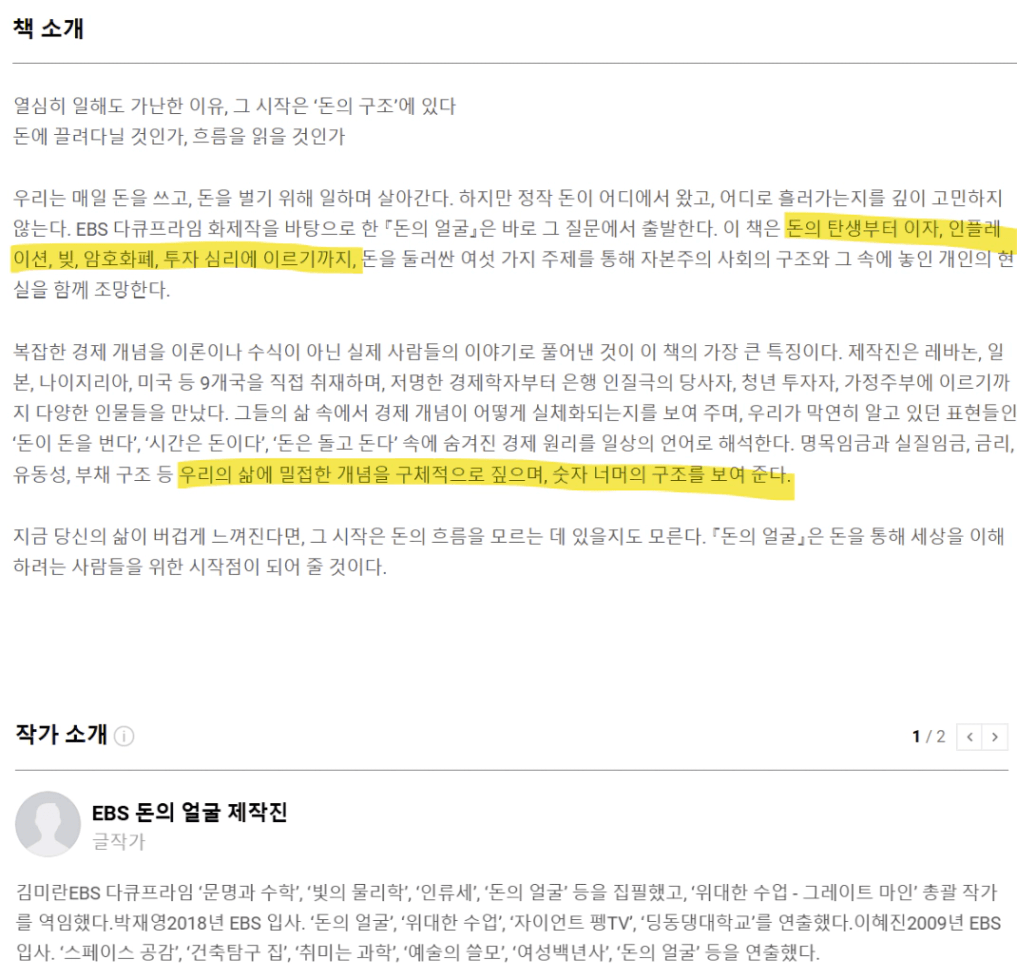 이 책은 EBS 자본주의와 비슷한 내용이면서, 좀 더 우리가 실생활에 적용해야 하는 부분들을 알려주기도 했다. 가령 월급이(연봉이) 인상된다고 해서 실질적으로 나아지는지 아닌지를 보게 한다던지, 대출은 무조건 나쁜 것이라는 편견을 벗어나 어떻게 하면 더 잘 활용할 수 있는지를 생각하게 하는 것들이다. 누구도 돈의 진짜 얼굴을 제대로 알려주지 않는다. 모르고도 살려면 살 수 있다. 하지만 우리의 노후를, 그리고 자녀 세대의 더 나은 미래를 만들어주기 위해서는 돈의 얼굴을 제대로 마주하고 받아들이기로 하는 것이 필요하다. 돈을 속물적인 것, 금기시해야 하는 것으로만 보면서 실상은 끝내 돈 때문에 힘든 삶을 살게 될 것인지 또한 내 선택이기도 하다.