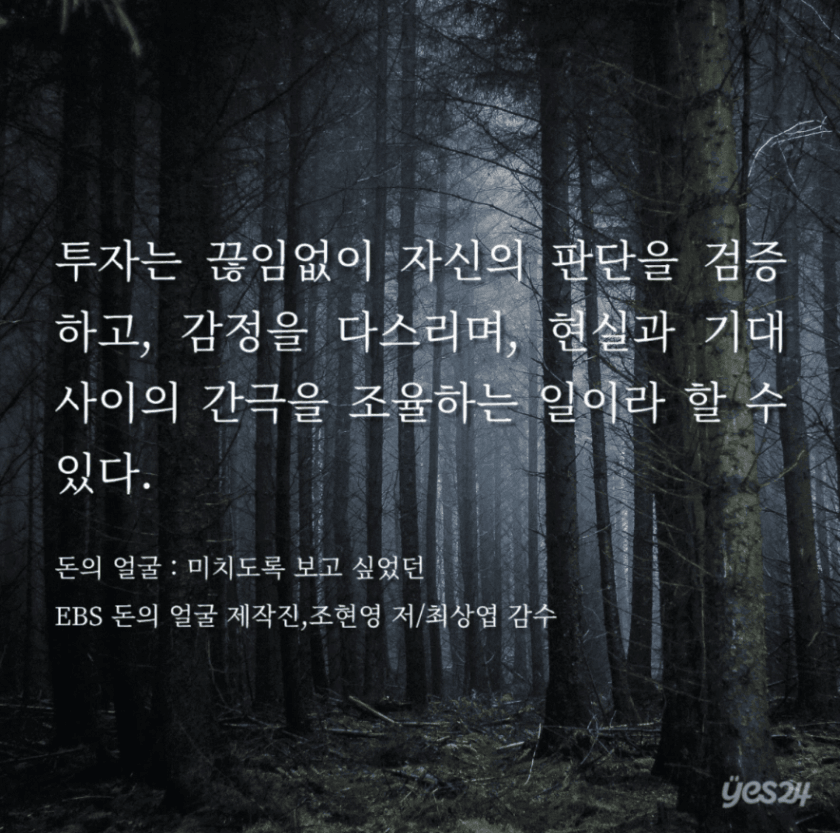 이 책에서 이야기하는 관점은 지극히 대중의 관점에서 바라보는 돈의 얼굴이라고 느꼈다. 안정적인 것과는 거리가 있는 투자라는 영역에 대한 걱정과 불안함, 그래서 앞으로 나는 어떻게 해야 할 것인가에 대해 정리하지 못하고 마음만 무거워진 그런 대중의 심정이 느껴졌다. 그게 대중이 바라보는 돈의 얼굴인가 싶다.