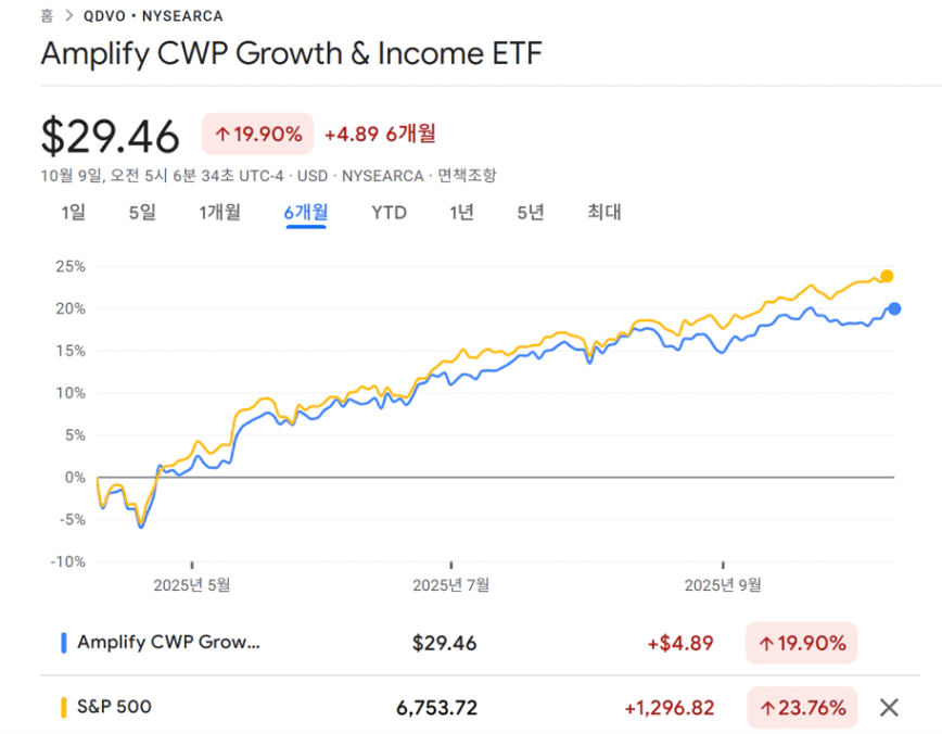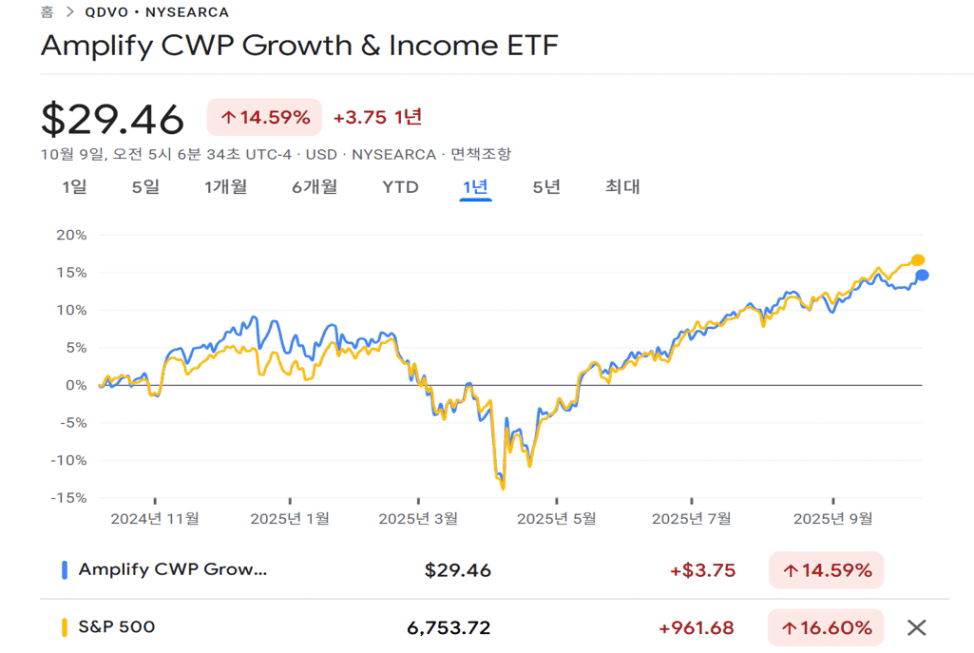 아래 차트는 S&P500과 QDVO ETF 1년 주가 비교입니다(25년 10월 8일 종가). S&P500 지수가 1년간 16.6% 상승하였고, QDVO는 1년간 14.6% 상승하였습니다. S&P500과 QDVO의 주가 움직임을 거의 비슷합니다.