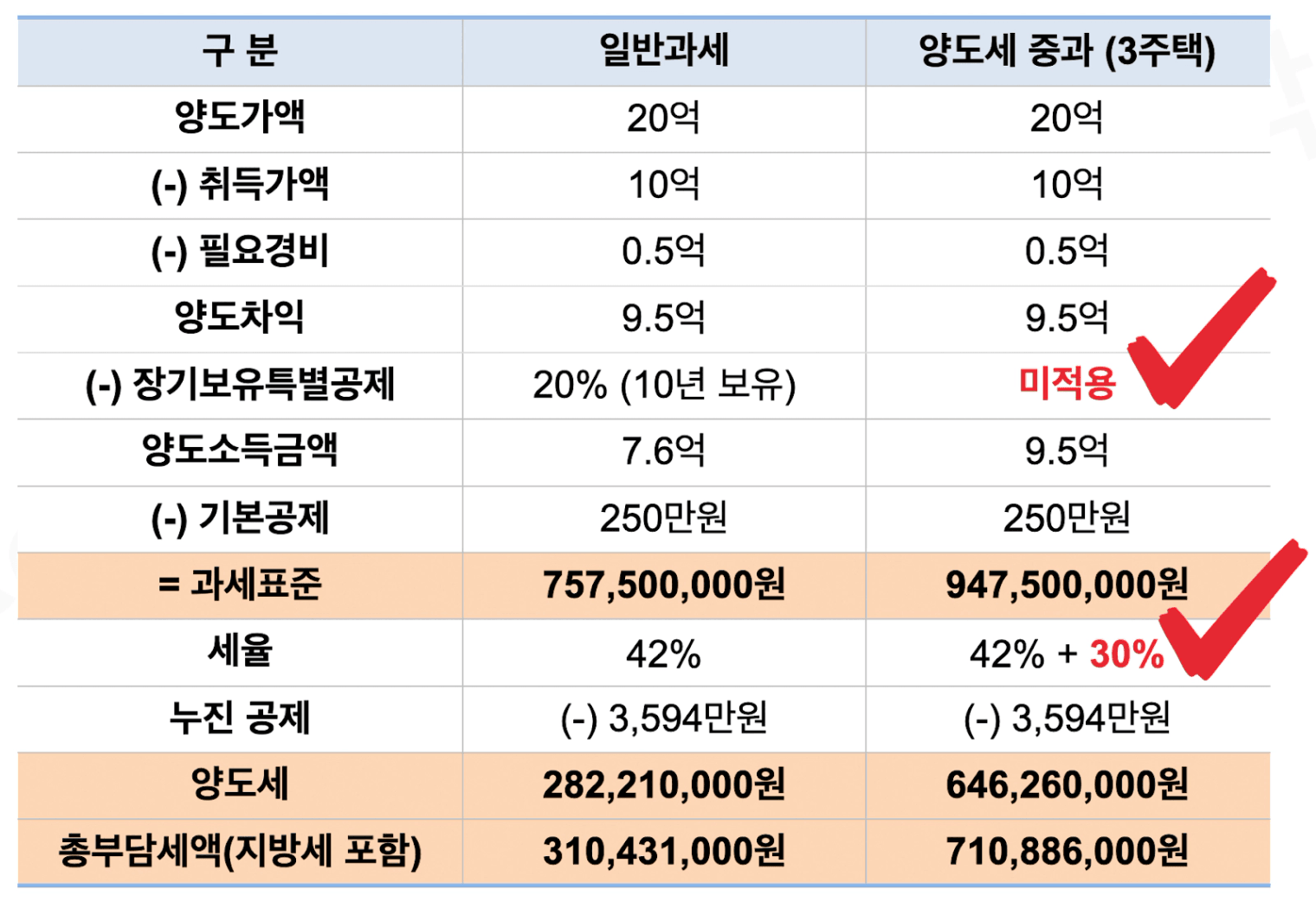 양도세 중과 적용시 1)장기보유특별공제를 하나도 받을 수 없고, 2)기본세율에 가산세율(2주택 20% 포인트, 3주택 이상 30% 포인트 가산)이 붙기에 세부담이 상당히 커집니다.