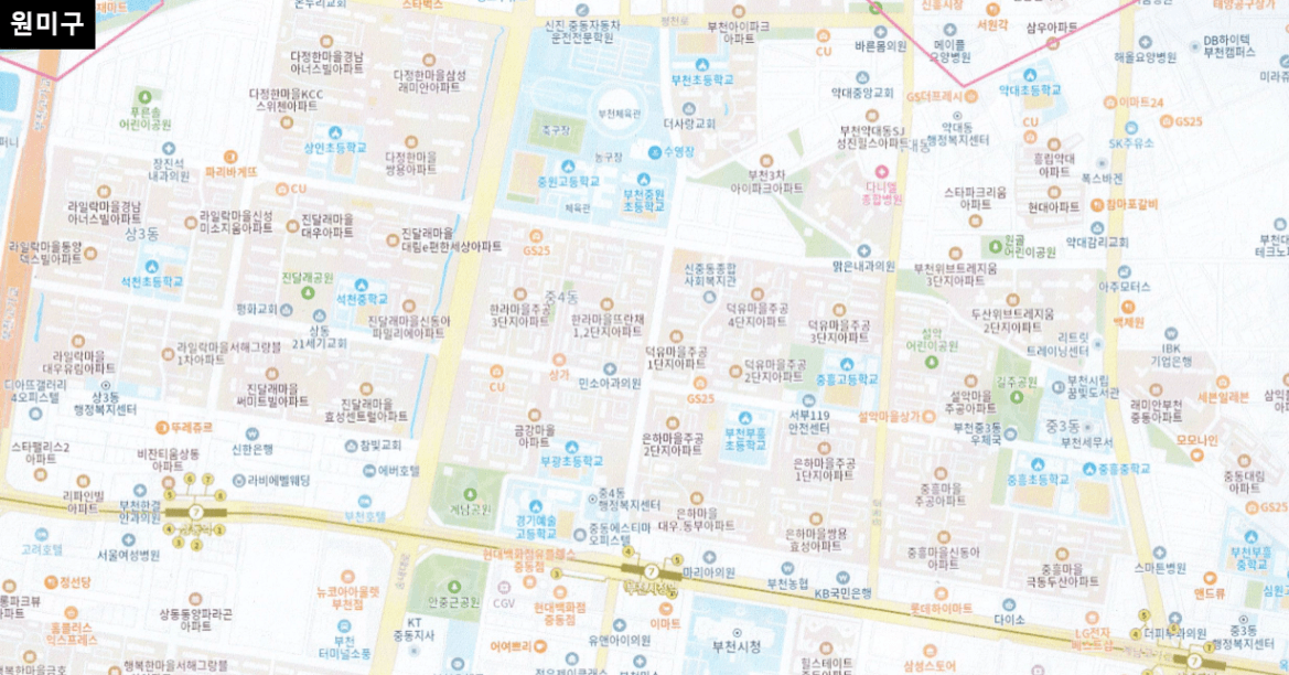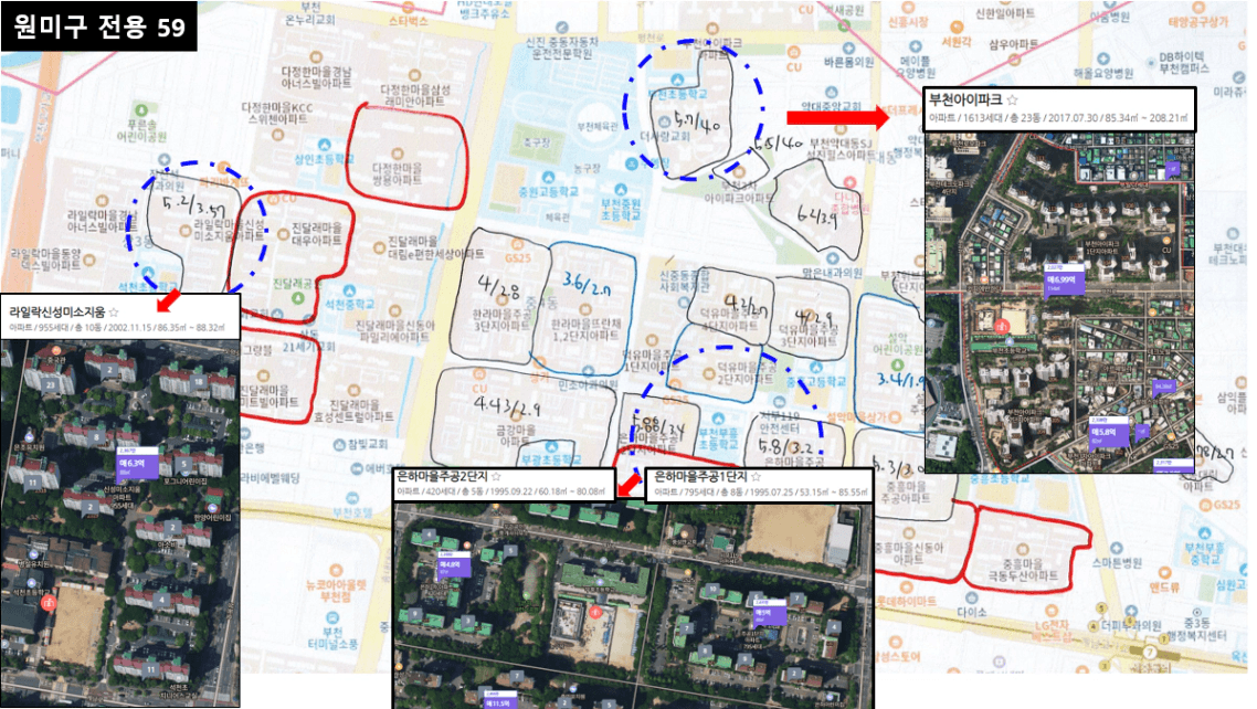 이와 같이 부천 상동의 라일락 신성 미소지움과 중동의 은하마을 주공 1,2단지, 약수동의 부천 아이파크 3단지를 보게되면 가격대가 비슷합니다. (5억대)