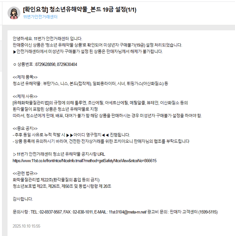 다음부터는 미리 웹유플렛에서 19세금지설정해주시면 됩니다. (칼, 본드, 접착제 류)