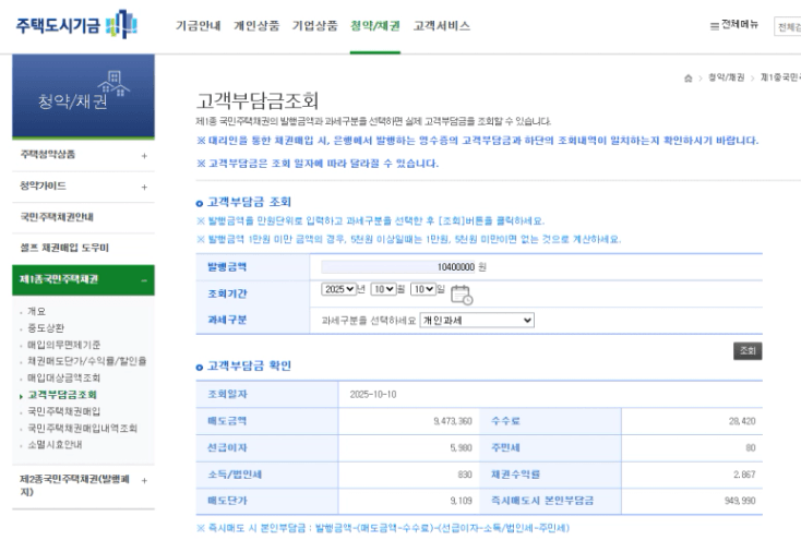 주택도시기금 > 청약/채권 > 제1종국민주택채권 > 고객부담금조회