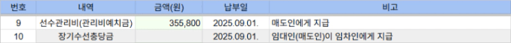 선수관리비, 장기수선충당금, 관리비, 가스비 등
