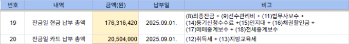 (잔금 입금, 기타 공과금 정산, 등기비(법무사보수, 취득세, 채권 등) 입금, 중계보수 입금)