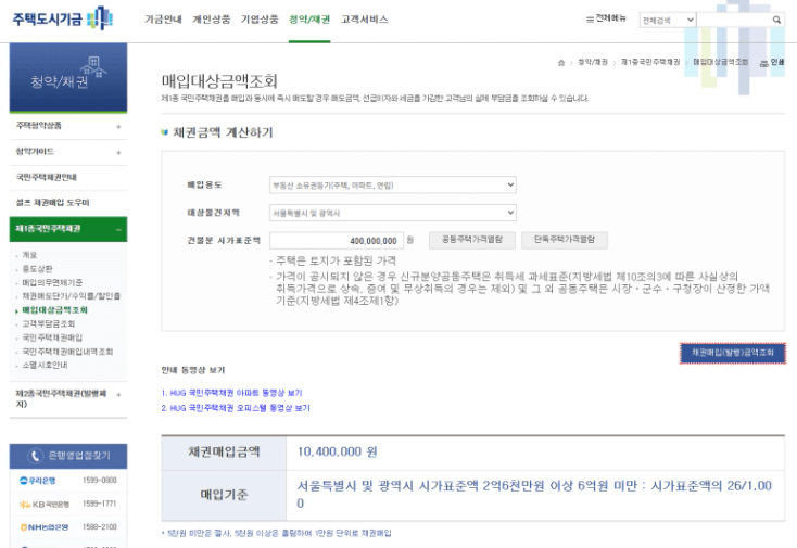 주택도시기금 > 청약/채권 > 제1종국민주택채권 > 매입대상금액조회
