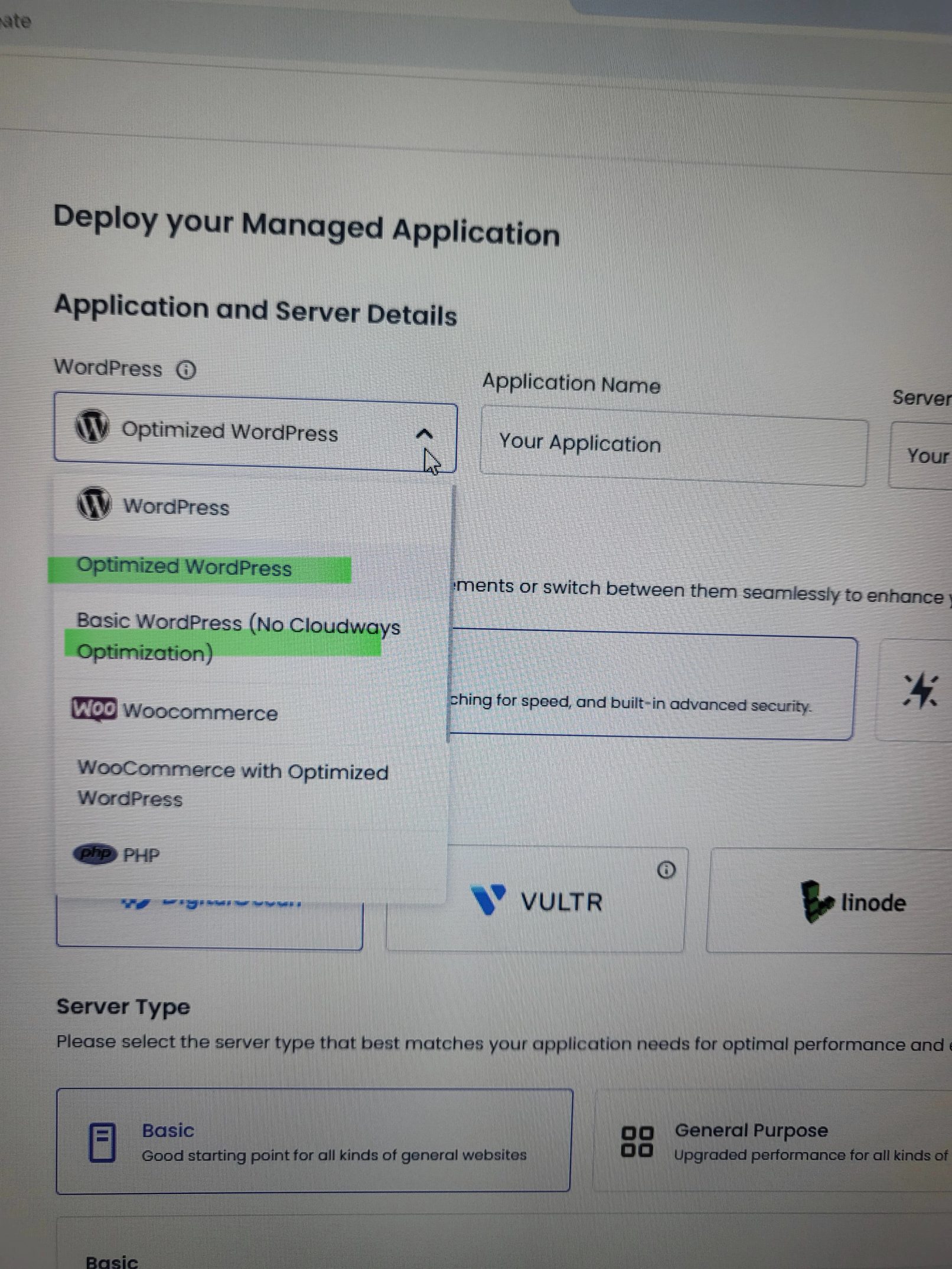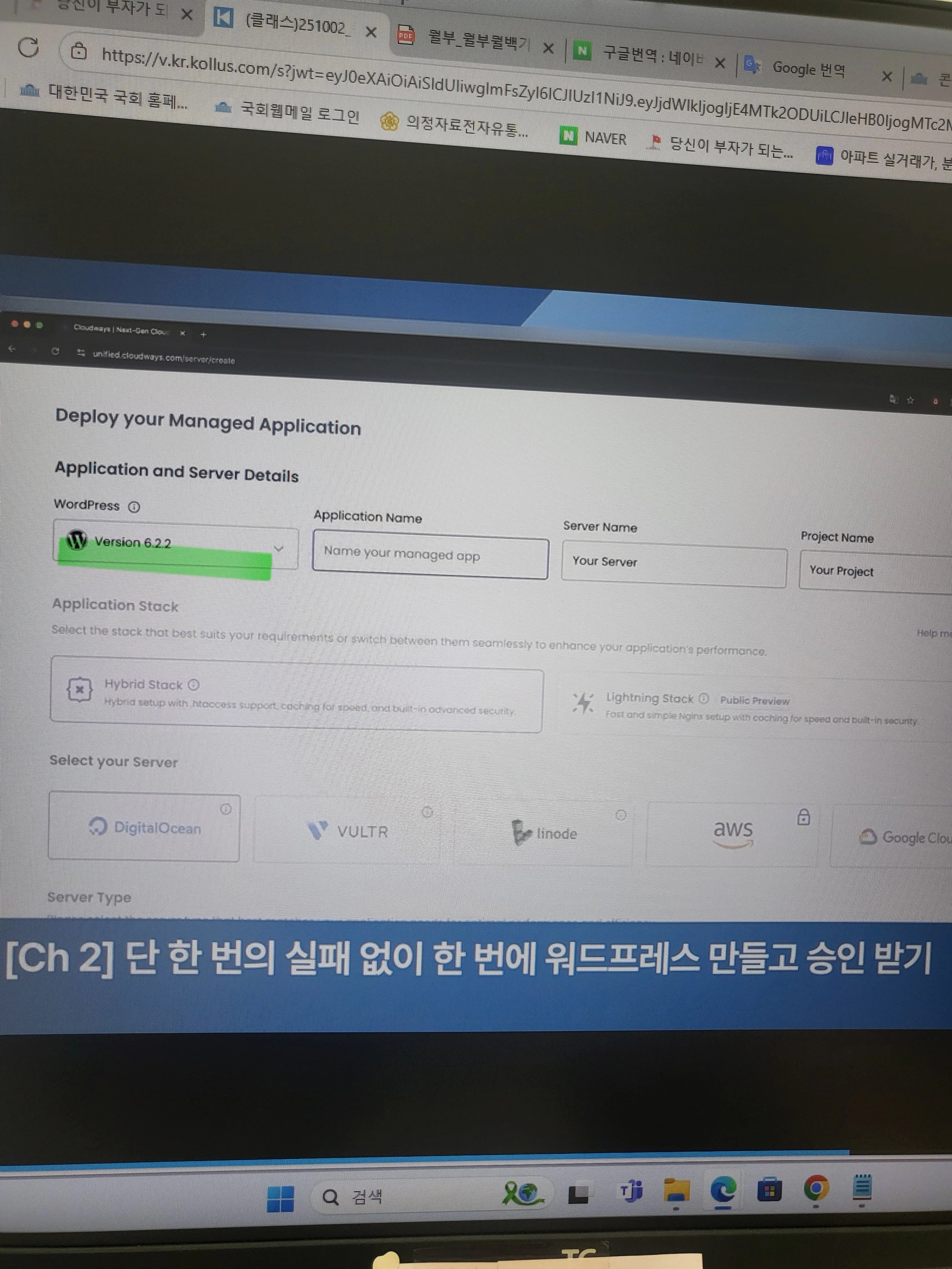 안녕하세요 너구나님 :) 결론부터 말씀드리자면 optimized wordpress를 선택하시면 됩니다! 9월에 촬영했는데, 연휴사이에 클라우드웨이즈가 업데이트 되어서 강의와 다르게 보이는 것 같습니다! 현재는 강의, 그리고 교안에도 해당 내용 반영해두었으니 참고 부탁드리겠습니다! 감사합니다 :)