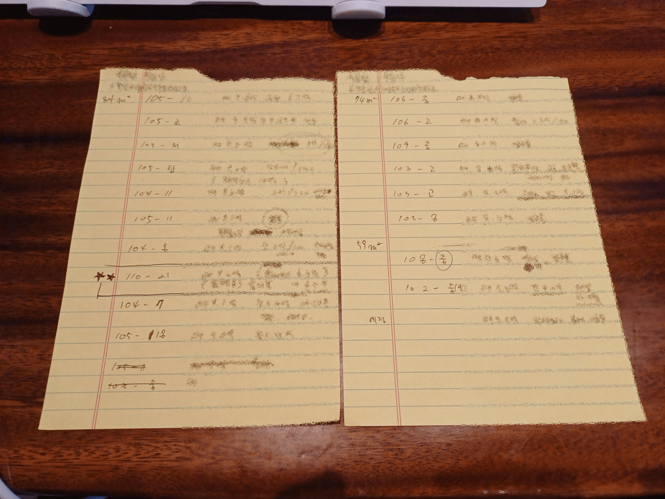 광고중인 모든 평형의 가장 비싼 물건부터 가장 싼 물건까지 가격과 상황을 종이에 적었다.