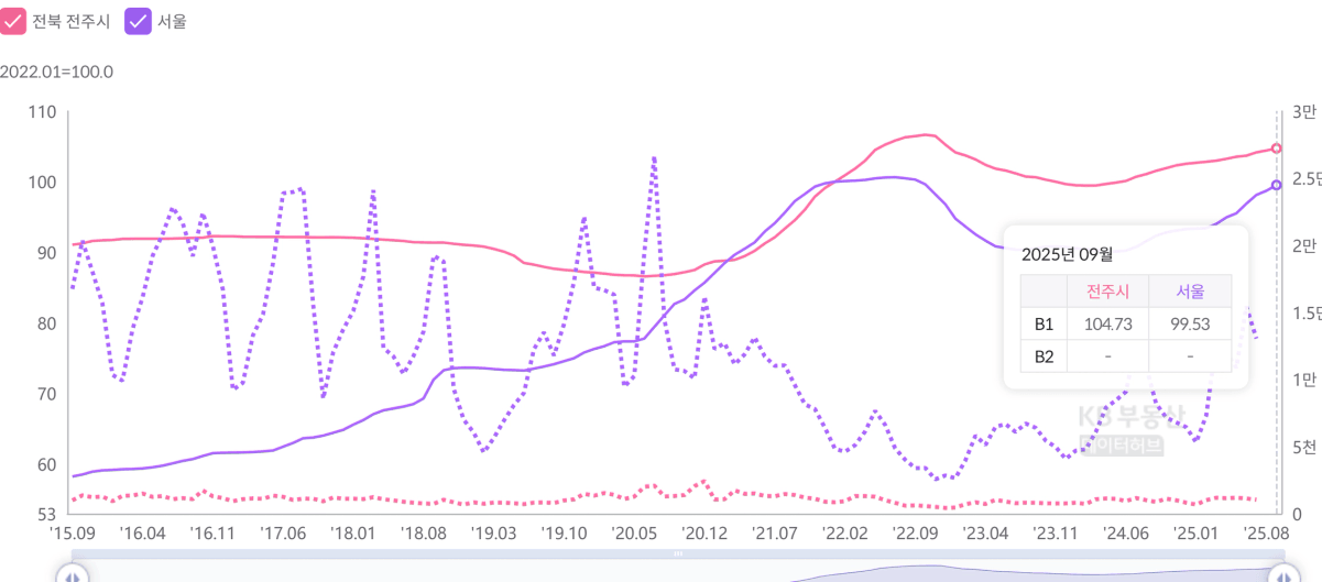 지방은 매우 많은 사람들이 살고 있는 거대한 크루즈함선 같은 수도권과 다르게 비교적 작은 요트와 같습니다. 바람이 한번 불면 방향이 쉽게 바뀝니다. 위의 그래프처럼 22년 고점 수준의 가격이 서울보다 훨씬 빠르게 전주가 먼저 도달했습니다. 배가 작으면 작을 수록 방향 전환이 쉽기 때문입니다. 여기에 더해서 입주 물량 자체가 적었습니다. 도시가 작은데, 입주 물량이 없다는 건 순풍에 돛단 배와 같습니다. 돈이 없는 데, 이런 도시에서 신축 아파트가 저렴하다는 건 돈 벌수 있는 절호의 기회입니다.