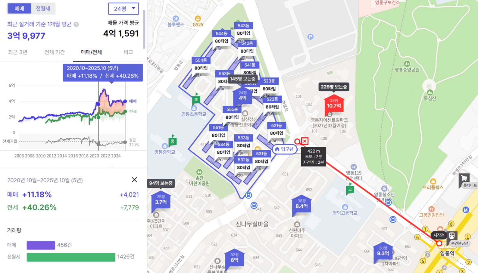 수원 영통구에 있는 구축 24평(방3 화1)아파트를 갖고 왔습니다. 수인분당선을 도보로 이용가능한 이 아파트는 근처에 초중고를 비롯해 상권도 잘 갖춰진 곳입니다. 그러나 서울에서 거리가 꽤 있어서 많은 분들이 마음 속에서 심리적으로 매수하기를 꺼리는 그런 곳 중 하나입니다.