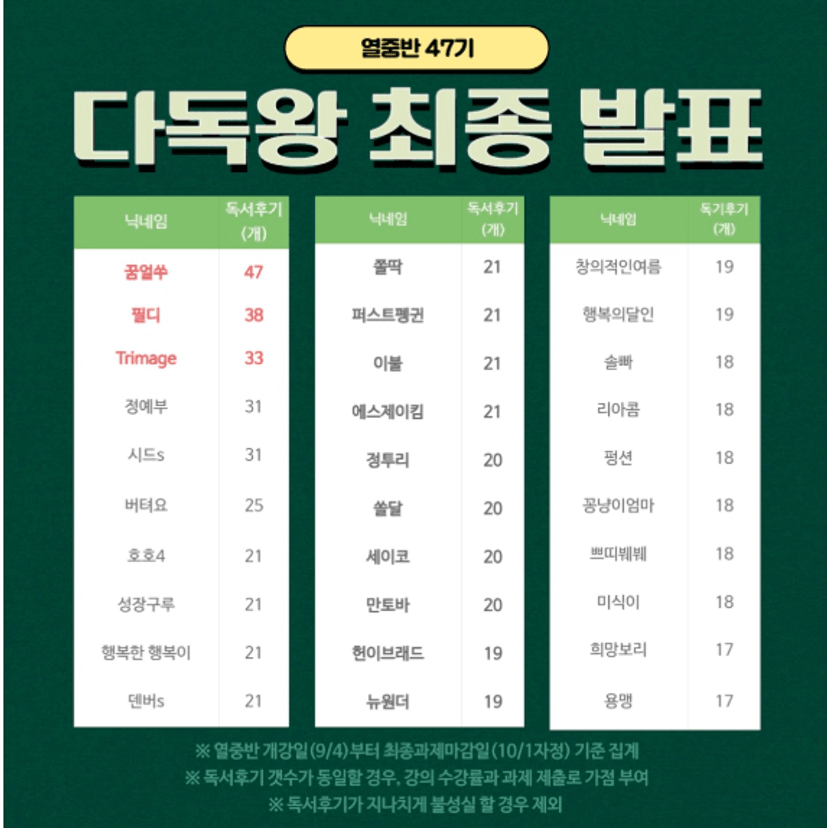이번 같이 하게 된 다독왕 분들과 함께할 수 있어 너무 좋았습니다. 쁘디붸붸님 말씀에 눈물이나 나도 더 열심히 해야겠다는 생각이 들었고, 힘들다 힘들다 하시면서 2호기 까지 하신 용맹님 펑션님 미식이님 말씀에 저도 모르게 힘을 낼 수 있었습니다.