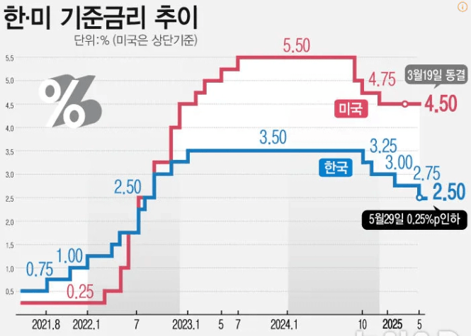 미국보다 한국이 금리가 낮으면 같은 돈이라면 미국에 돈을 넣어두는 게 이득이니 기축통화를 가지고 있는 미국으로 외화가 유출된다. 투자자들이 미국으로 빠져나간다는 소리다. 그에 따른 환율 상승, 경기 위축, 투자 부진 등이 있을 수 있는데 요즘 환율은 또 떨어지다가 소폭 상승 중. 그래도 요즘은 외국인 투자자가 국내에 투자하고 있어 환율 방어중이다. (처음 금리차가 나기 시작했을 때는 외국인들 빠져나가고 난리였는데, 금리차도 결국은 적응하는 것 같기도?)