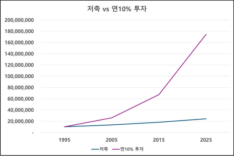 1995년에서 2025년까지의 저축과 연10% 수익을 거두는 투자의 결과를 비교해 보겠습니다.