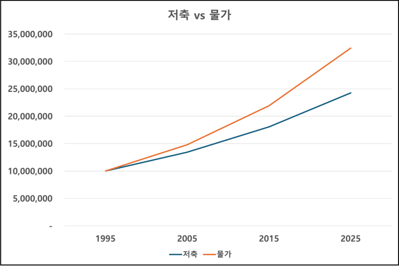 2025년의 저축과 물가의 지수를 1000만원의 단위로 바꿔 그래프로 비교해 보았어요.