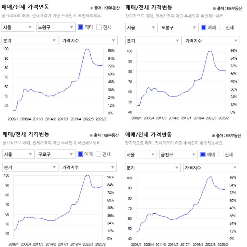 마지막으로 노원, 도봉, 구로, 금천을 살펴봅니다. 흔히 서울 안에서 입지 순으로 가장 늦은 지역입니다. 위의 지역과 비교하면 전 고점을 돌파 못했다는 공통점이 있지만, 꼬리 끝에서 기울기 차이가 보입니다. 하락을 멈추고 상승 준비는 했지만, 상승하고 있다고 보긴 어렵습니다. 하지만 이대로면 이들도 곧 따라갈 것으로 예상됩니다.