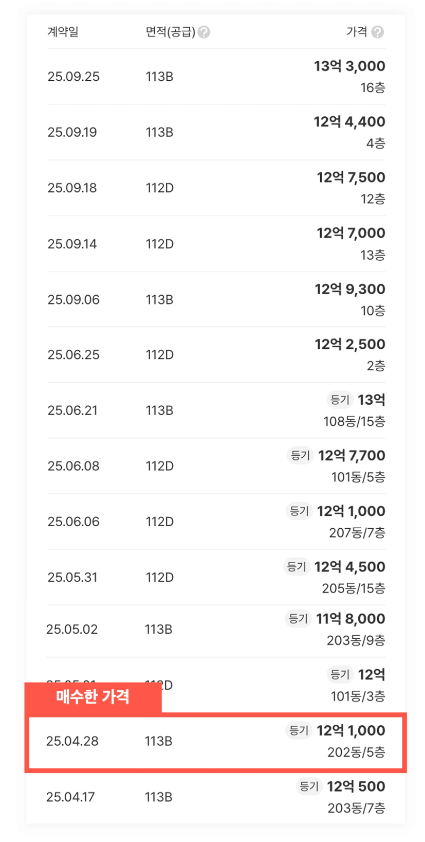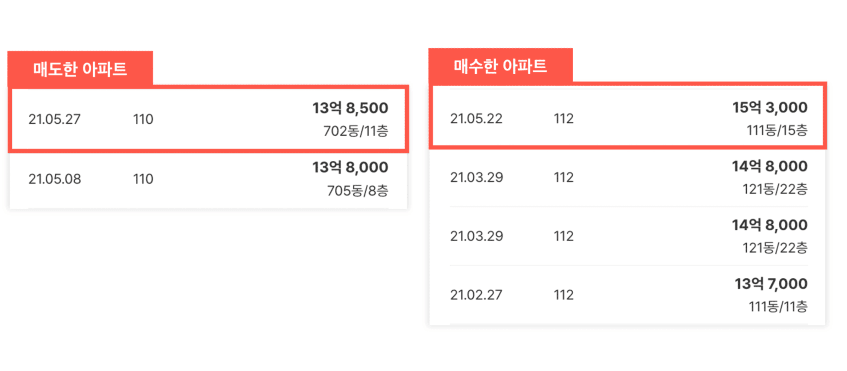 그렇게 이 아파트를 매도한 후 매수한 아파트와 이 아파트의 최근 거래 가격을 보여드릴께요