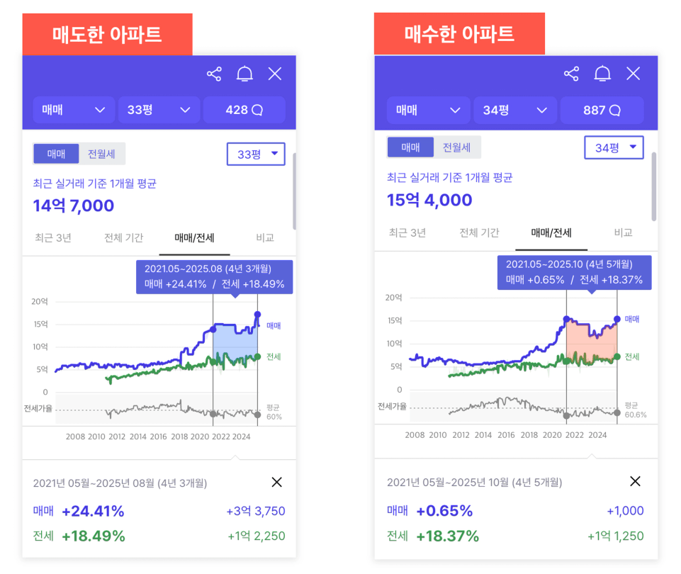 현재 시점에서 수익율을 보면 13.8억에 매도한 단지가 더 상위 생활권 급지에 있기 때문에