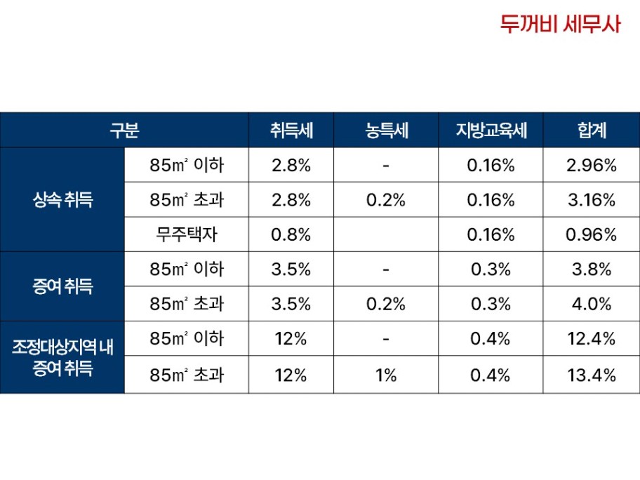 일반적인 증여취득세는 보통 4% 정도인 데 반해, 조정대상지역 내 증여취득세는 12~13%로 세 배 가까이 올라갑니다.