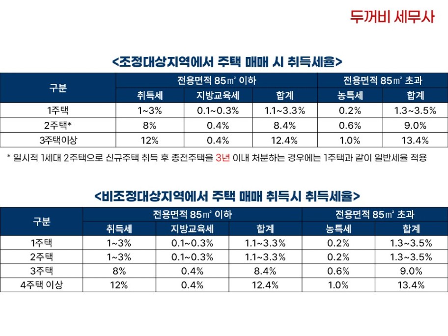 일반적인 매매 취득세라면 2주택 까지는 1~3%의 일반세율을 적용받지만, 조정대상지역이라면 2주택 거래부터 바로 8~9%의 중과세를 먹입니다. 3주택부터는 12~13%를 적용받고요.