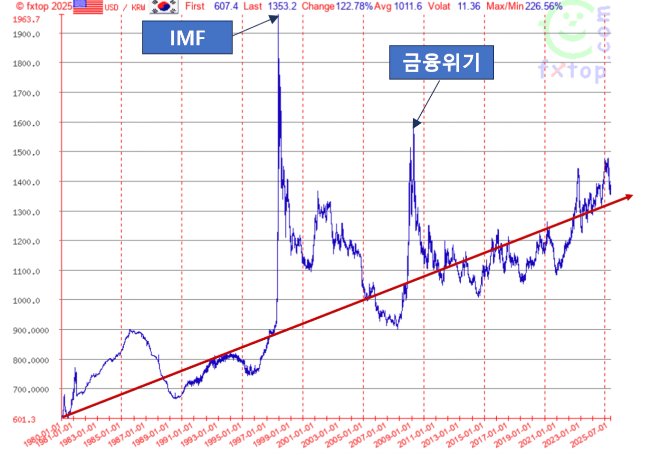 특히 1998년 IMF 외환위기로 나라가 달러가 없어 부도날 뻔 할 때는 환율이 800원에서 거의 2,000원으로 급등하였습니다(원화 가치가 순식간에 60% 넘게 삭제되었습니다).
