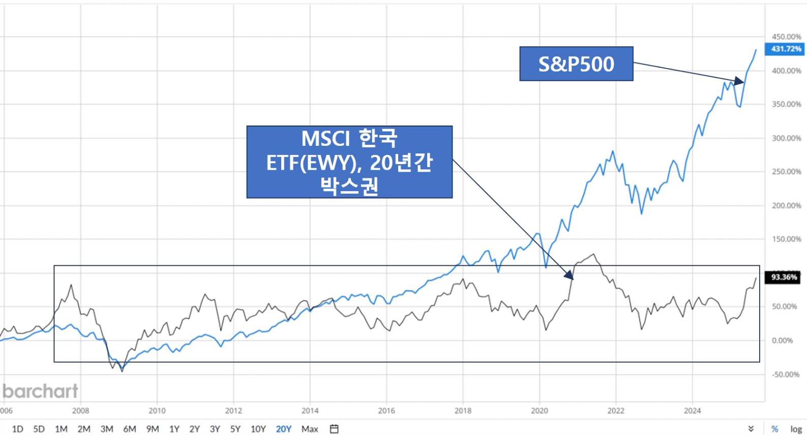 그러나 달러 기준으로 보면(원화 약세를 고려한) 20년간 박스피이고, 여전히 2021년 고점을 못 넘었습니다.