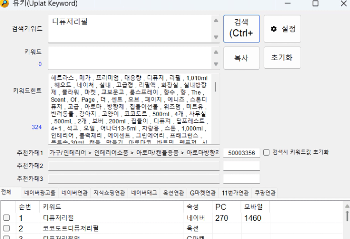 반면, 디퓨저리필로 다시검색했을때 검색량은 PC/모바일 각각 270, 1460으로 나와있어서 혼란스러워요ㅠㅠ