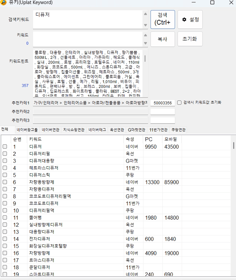 1번 디퓨저에는 PC/모바일 검색수가 9950, 43500으로 나와있는데,