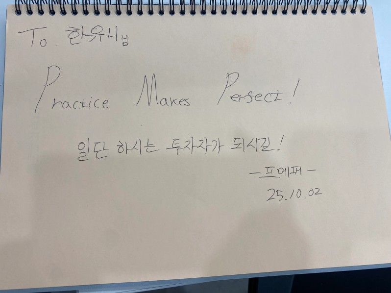 저는 연예인 사인도 잘 안받는 사람인데ㅎㅎ 저의 조 포도링 튜터님과 조원분들의 응원에 힘입어 부끄러움을 무릅쓰고 프메퍼 튜터님의 사인도 알차게 받아왔습니다. 일단 하는 투자자가 되겠습니다^^