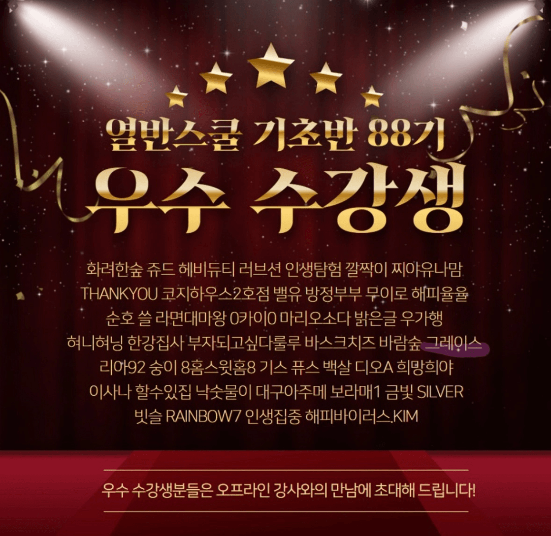 하지만 기대와 달리, 한 번도 우수 수강생으로 선정되지 못했을 때는 솔직히 마음이 아팠습니다.