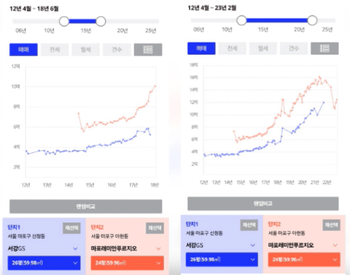 많은 분들이 잘 알고 계시는 마포래미안푸르지오라는 마포구 대장급 아파트는 2018년 6억에서 10억 레벨로 단기간에 가격이 매우 많이 상승했습니다. 이 시기 같이 마포구에 있는 서강GS라는 단지는 마포 공덕뉴타운과 거리가 꽤 있다는 이유로 가격이 거의 오르지 않은 상황이었습니다. 마포구라는 아주 좋은 위치에 있음에도 불구하고 가격이 오르지 않았던 상황이었습니다.