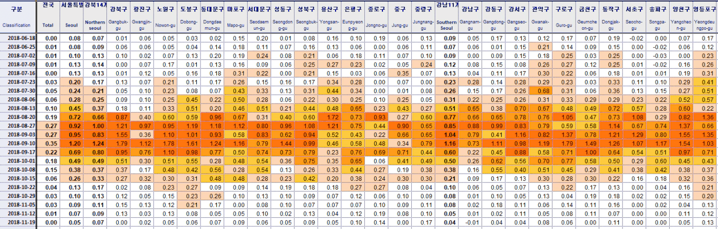 최근에 굉장히 핫했던 마포구라는 지역에서 2018년 분위기를 살펴보겠습니다. 2018년 KB주간 시계열을 살펴면 말 그대로 빨간 불장이었습니다. 참고로 KB부동산에서 1주일에 0.2% 이상 상승 시 빨간 음영이 진해지는데, 이 시기 대부분 서울이 불타오르고 있었고, 마포구는 지금의 시장처럼 1.0% 이상 상승했던 뜨거웠던 곳 중 하나였습니다. 이정도 상승이면 1주일에 3~4천씩 오른다고 생각하시면 됩니다.