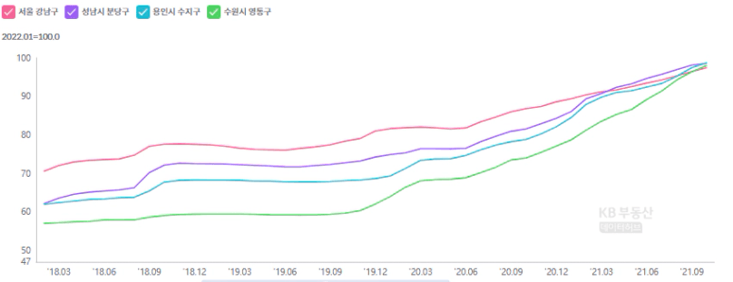 이 때 팁을 드리자면 강남을 기준으로 동서남북 멀어지는 순서대로 흐름이 온다는 것을 알아 주시면 좋겠습니다. 위의 강남 > 분당 > 수지 > 수원은 강남을 기준을 남쪽으로 퍼지는 시세 흐름이었다면, 서쪽으로 가면 강남 > 영등포 > 구로 > 부천 이라는 순서도 있습니다. 이걸 동쪽으로 적용하면 강남 > 강동 > 구리 > 남양주로 적용해볼 수 있겠죠. 이런 식으로 내가 보는 지역이 너무 뜨겁다면 바로 다음 지역으로 가서 선점하는 것도 방법이 됩니다.`