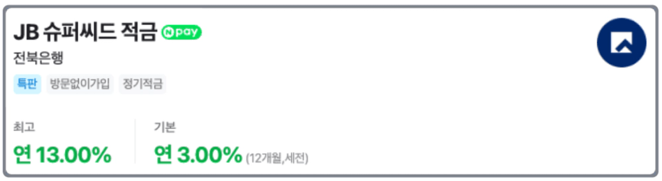 전북은행 | JB 슈퍼씨드적금 | 13.0% | 12개월 | 씨드 당첨 |