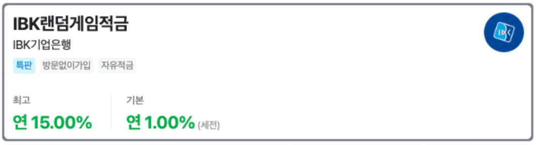 IBK기업은행 | 랜덤게임적금 | 15.0% | 100일 | 게임 승리 |