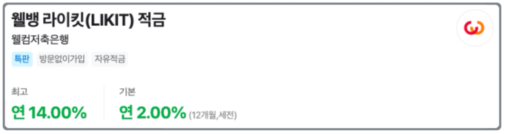 웰컴저축은행 | 웰뱅 라이킷적금 | 14.0% | 12개월 | 롯데카드 실적 |