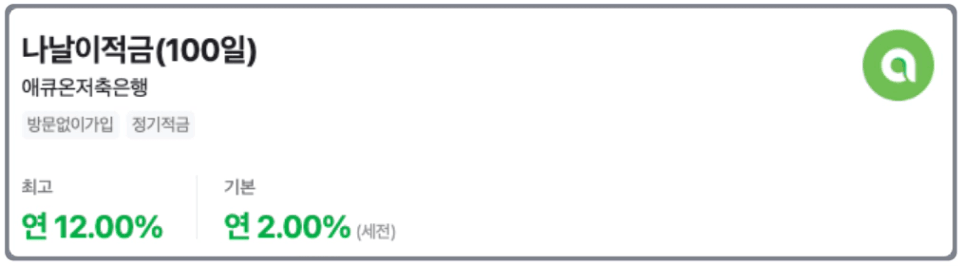 애큐온저축은행 | 나날이적금 | 12.0% | 100일 | 매일 입금 |