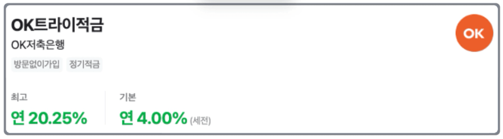 OK저축은행 | OK트라이적금 | 20.25% | 30일 | 드라마 시청 인증 |