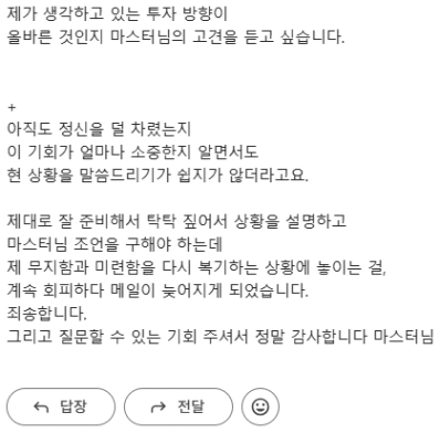 튜터링데이 전 마스터님은 메일로 각자 발표 예정인 사전임장보고서를 제출하고, 원할 경우 개인정보(5가지) 및 질문 함께 보내라고 하셨어요. 임보 먼저 제출하고, 저는 또 뜸을 들이다가 하루 늦게 메일을 다시 보냅니다.