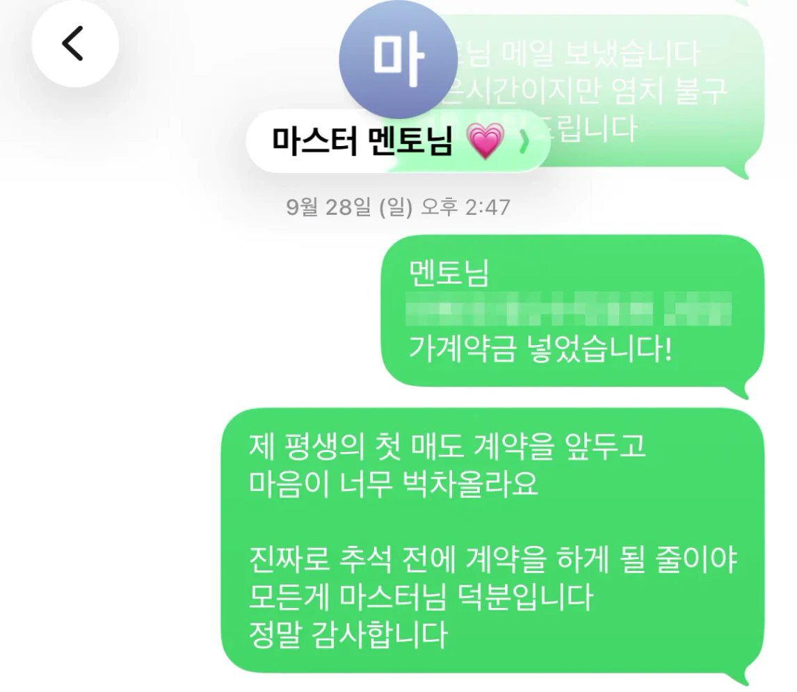 당일 오후 늦게 보낸 메일에 늦어도 상관없으니 가능하신때 연락 주십사 부탁드렸는데 정말 일정 마치신 뒤 전화 연락이 왔어요. 검토 후 진행해도 나쁘지 않겠다 말씀 주시면서 매수 하게 될 경우 갖게 될 장단점에 대해 말씀해주셨고 더불어 계약과정에 대한 디테일 관련하여 튜터링을 해주셨습니다. 지금의 시장 상황에서 집주인이 원하는 상황을 크게 건들지 않으면서도 내가 계약을 유리하게 가져가기 위해 취해야 할 액션에 대해 말씀해주셨어요.