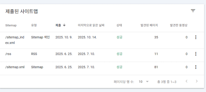 맨 밑에 있는 sitemap.xml과 rss는 신청했었습니다.
