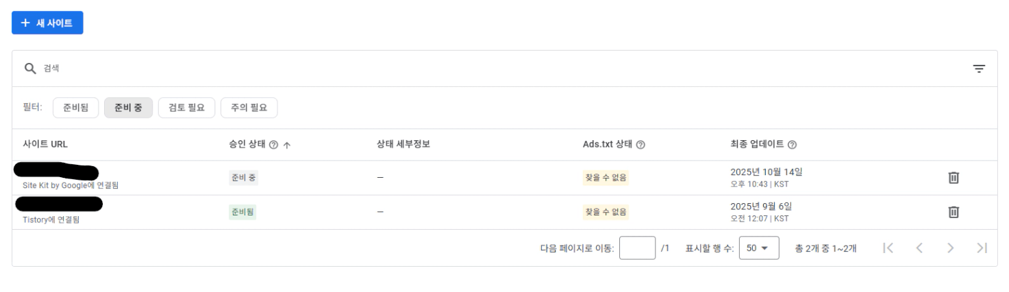 그래서 현재 구글 에드센스 승인 사이트 페이지에서 하나는 티스토리로 승인받은 도메인2와, 이번에 승인신청한 도메인1이 준비중으로 뜹니다.