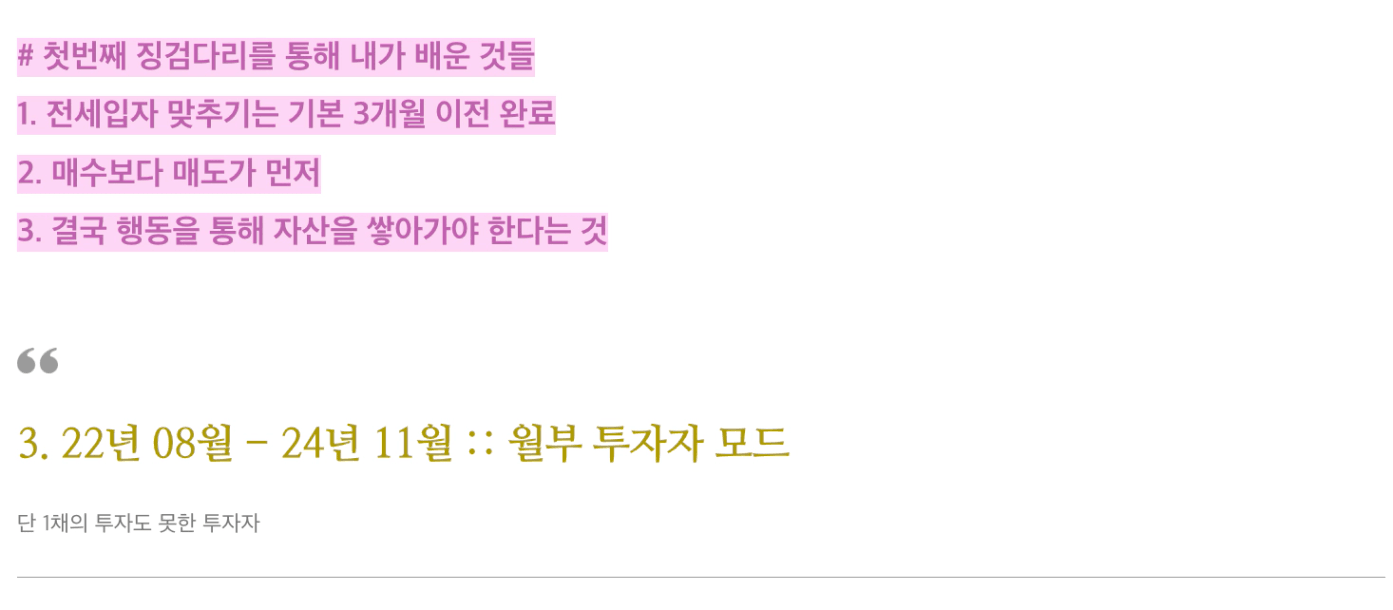 월부에 들어와 첫번째 내집마련 후(22년 08월) 지금까지 투자자가 되어야 겠다는 생각에만 몰입하여 이 기간동안 제가 했던 모든 선택들과 결과물을 아무것도 아닌 것처럼 생각했던 것 같습니다. 아무래도 투자자들 사이에서 제가 했던 내집마련과 갈아타기는 마치 미운오리 새끼 같은 느낌이기도 했고 뭔가 겉도는 것 같은 느낌이였기 때문입니다. 하지만 이렇게 지나온 시간을 되돌아보고 내마기 강의를 다시금 들어보면서 저의 생각이 잘못 됐음을 알게 되었습니다. 투자든 내집마련이든 갈아타기든 결국 본인의 자산을 증식하고 늘려가는 선택들이기에 옳고 그름이 없다는 것을 이제는 조금 알 것 같습니다.